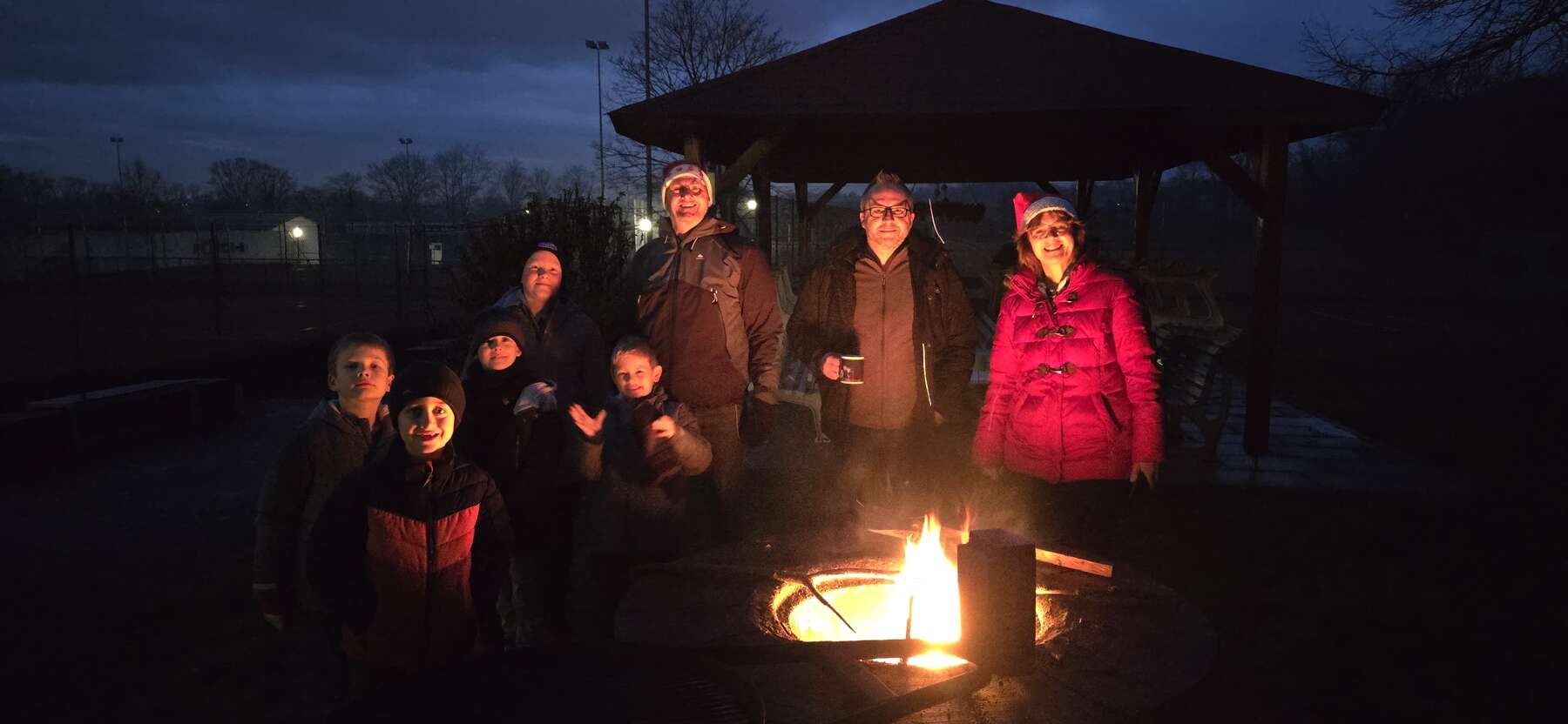Wir trafen uns nachmittags am Tennisheim. Zur Stärkung standen Kuchen, Kleingebäck, Punsch und Glühwein zur Verfügung. Trotz der milden Temperaturen schmeckte es allen gut. Mit einbrechender Dunkelheit marschierten wir bei Fackelbeleuchtung los, bis ins Wiesental hinein und in Richtung Degmarn. Da der Kanu-Club an diesem Tag sein Dreikönigsfeuer veranstaltete, und eine Vereinswandertruppe nicht vorbeimarschieren sollte, wenn ein anderer Oedheimer Verein feiert, nahmen wir einen geselligen Einkehrschwung bei den Kanufahrern. Dort trafen wir viele bekannte Gesichter und konnten bei der Gelegenheit sogar noch zwei Tennisfreunde einsammeln.