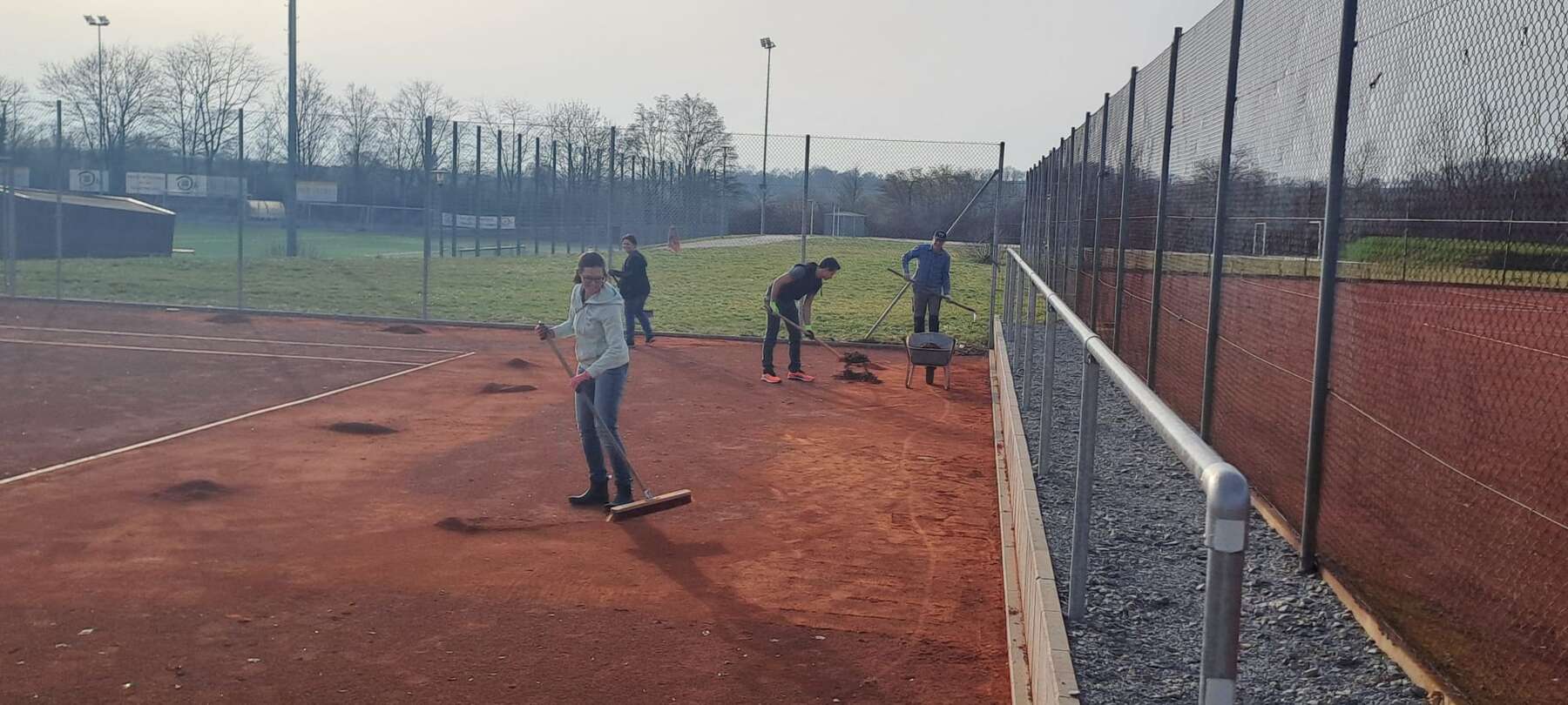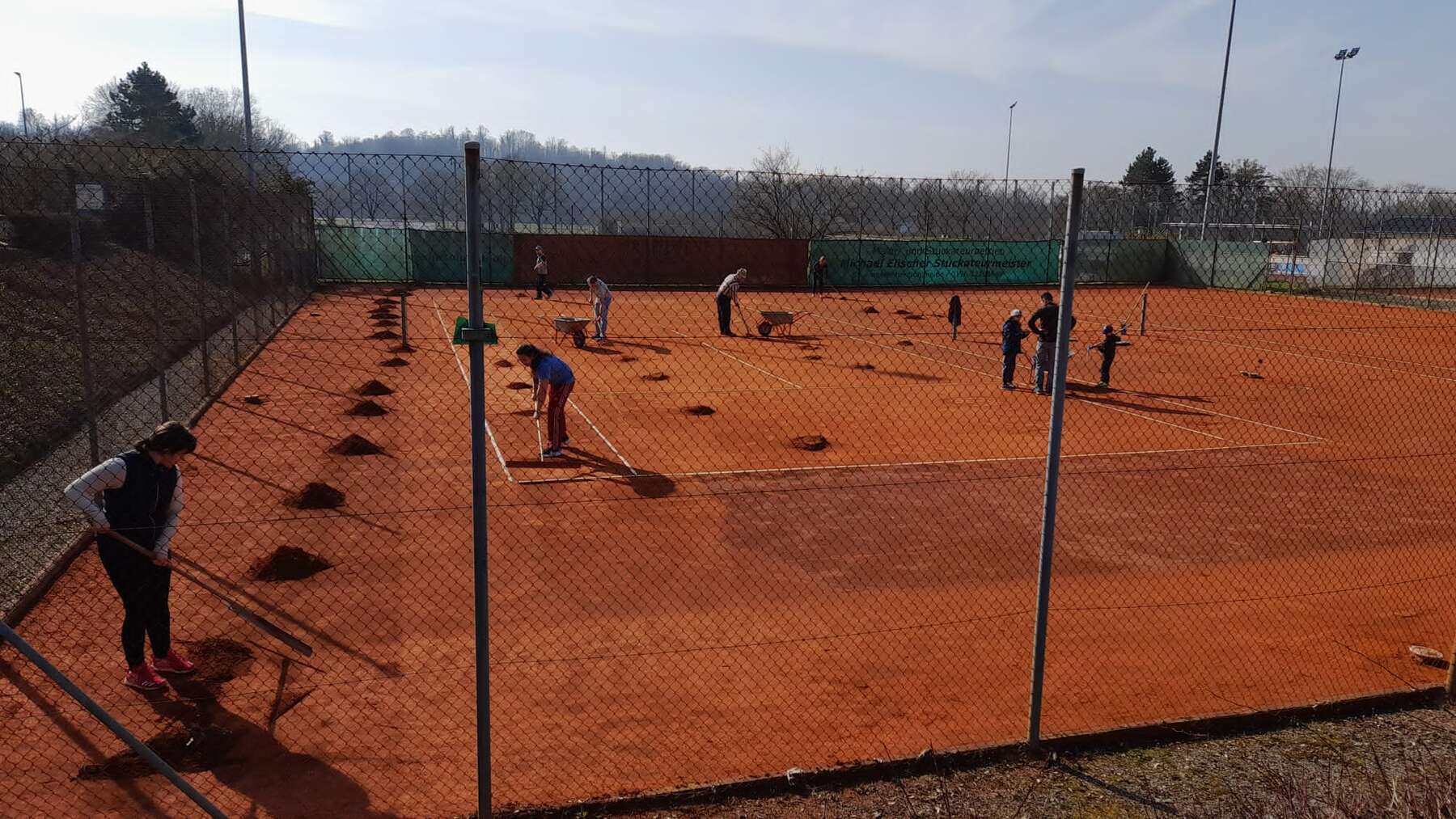 Die Instandsetzung unserer Plätze nach der Winterpause erfolgt in zwei Arbeitsgängen: Im ersten wird im Wesentlichen der alte überschüssige Sand abgetragen, in Schubkarren verladen und zum Container gebracht. Weiterhin werden Reste vom Herbstlaub auf der Anlage zusammengekehrt, Linien befestigt und einiges mehr. Die Arbeiten sind anstrengend, deshalb braucht man viele fleißige Leute, die zupacken.