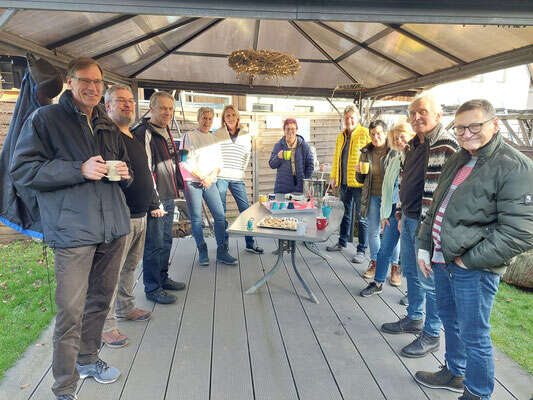 Mittlerweile ist unsere Winterwanderung schon zur guten Tradition geworden. Ein wenig ungewohnt für den Monat Januar zeigte sich das Wetter: Die Nachmittagstemperaturen stiegen am Samstag hinauf bis 16 Grad. Aber wenn Winter angesagt ist, schmeckt den Tennisfreunden der angebotene Glühwein trotzdem. Nur wenige Wanderer wichen auf Kaltgetränke aus, als wir uns um 15.00 Uhr in der Laube unseres Vorstands Thommy trafen. Nach Umtrunk und Imbiss führte uns die Wanderroute in Richtung Degmarn. Auf der Strecke gab es die neue Flutmulde zu besichtigen, die Wege dorthin waren leider komplett aufgetaut und matschig (auf festen Wegen kann ja jeder laufen… ).