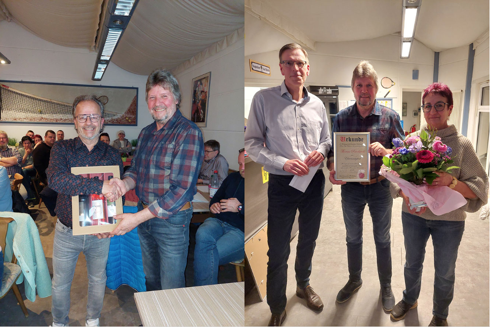 Neben der Ehrenmitgliedschaft des TC Oedheim übermittelte auch der WTB seine Anerkennung für 30 Jahre erfolgreiche Vorstandsarbeit in Form einer Verbandsehrennadel in Bronze versilbert und einer Urkunde. Präsente wurden übergeben. Zum Glück bleibt uns Thommy im Verein und für spezielle „projektbezogene Arbeiten“ erhalten.